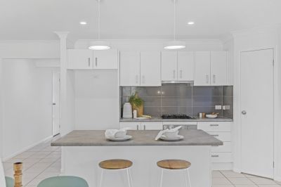 The kitchen is the heart of the home, thoughtfully designed with a central island bench that doubles as a space for meals, conversation, and connection. Feature pendant lighting adds a stylish touch, while quality appliances and generous bench space make daily cooking and entertaining effortless. It flows seamlessly into the open-plan living and dining area, where glass sliding doors open directly to the backyard, blurring the lines between indoor comfort and outdoor living.