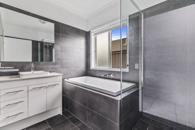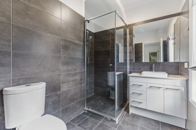 Immediately to your left is the master suite, a private retreat tucked away from the rest of the home. It features a walk-in wardrobe and a sleek ensuite with dark floor-to-ceiling tiles, a floating vanity, large shower and private toilet. Perfectly placed, it offers both privacy and ease of access.