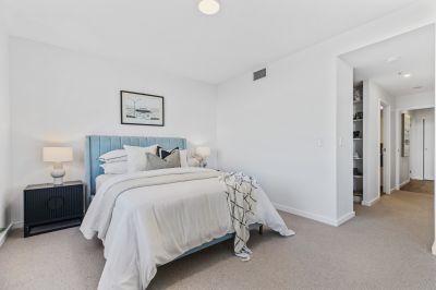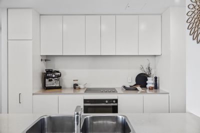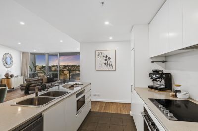 The heart of the home is an expansive open-plan space, where the kitchen, dining, and living areas flow effortlessly together before opening out to the alfresco terrace. It's a space that invites both celebration and calm - a setting for long, laughter-filled lunches, quiet mornings with a coffee, and evenings where the city lights create a glittering backdrop. The kitchen's stone benchtops and quality appliances make everyday cooking a pleasure, while generous storage keeps the design sleek and uncluttered.