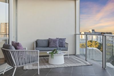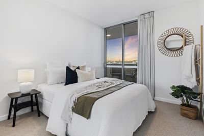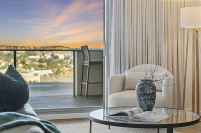 From sunrise on the terrace to sunset over the skyline, this sixth-floor residence in the prestigious Spire complex combines elegant interiors with sweeping city views and the unmatched walkable convenience of Newcastle West. Golden sunshine streams through walls of glass each morning, filling the home with warmth, while evenings invite you onto the balcony to watch the city shift from day's glow to the sparkle of night.